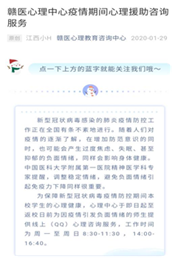 教工第二党支部发挥心理学专业技能,开展疫情期间心理健康护理知识科普宣传,全体党员参与编制了《赣南医学院新型冠状病毒感染的肺炎心理防疫手册》,为师生心理健康保驾护航。同时,开通了疫情防控期师生心理援助服务,并针对全校学生开展疫情下心理危机状况摸查,帮助师生疏导消极情绪,给予支持和希望,促进身心健康,坚定信心、同舟共济、坚决打赢疫情防控阻击战。