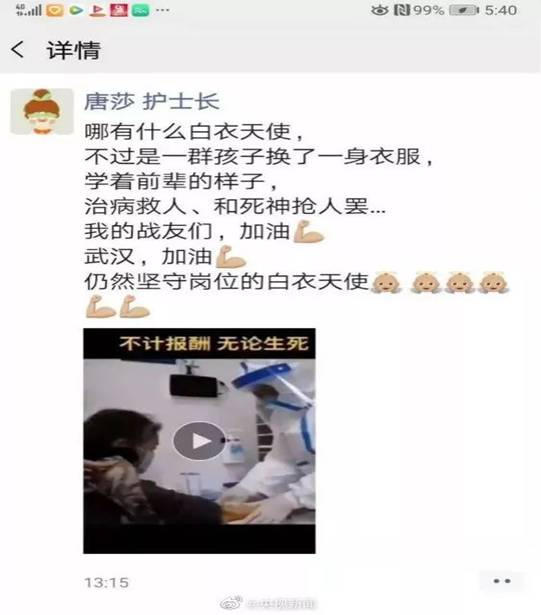 武汉市中心医院的护士长唐莎在朋友圈发了这样一段话:“哪有什么白衣天使,不过是一群孩子换了一身衣服,学着前辈