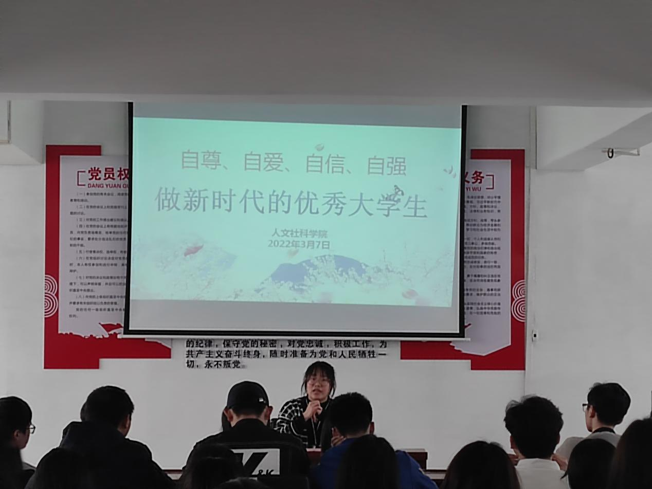 3月7日下午,人文社科学院学工办周佳阅老师在党员活动室召开“自尊、自爱、自信、自强,做新时代的优秀大学生”宣讲会,学院各班班干部和寝室长等学生骨干共计70余人到场参会。