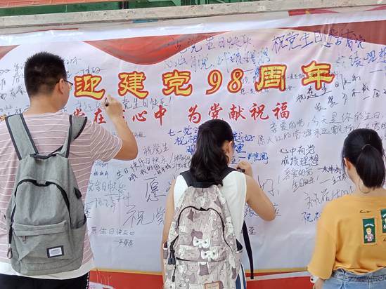 在共庆党的华诞、共享党的荣光、共建伟大复兴的爱国爱党氛围中,活动如火如荼地进行着。在现场,参与活动的师生们绘心以笔,寄情予党,书写下自己对党和国家的美好祝愿,以真挚且虔诚的情感向党的98周年华诞献礼。兰霞辉同学写道:亲爱的党,今天是你的生日,愿火红的党旗永远飘扬。陈羿仿同学写道:愿党越来越好,祖国越来越强大。张琳同学写道:不忘初心,牢记使命,使命在肩,奋斗有我。
